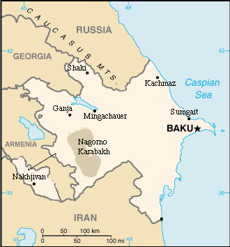 Before entering a discussion of the Republic of Azerbaijan, it should be mentioned that the territory usually referred to as Azerbaijan stretches from the regions to the south of Lake Urumia in the south to the Daghistan region of the former Soviet Union to the north. It is the entire territory, which is at the present, between the Caspian Sea and Armenia and Georgia. Before the 19th century it was a part of the territory ruled by Iranian rulers. Two consecutive defeats sustained by Iran in the 19th century at the hands of Russia (see below) divested Iran of its northern territories in Azerbaijan. Thus, in modern times, this area is divided between Iranian Azerbaijan with its provincial capital at Tabriz, Iran, and the Republic of Azerbaijan with its capital at Baku. The Aras river forms the borderline between the two Azerbaijans.