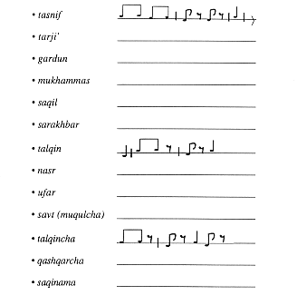 An analysis of shashmaqam indicates that its solid cyclical structure owes a great deal to the poetic system underlying it. The use of some of the rules of 'aruz in shashmaqam is easily observable. These include hazf, afzaish, and tabdil.4 The usuls of tasnif take three different forms in shashmaqam. Its main or full form appears in the buzruk, nava, and sigah: