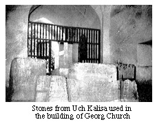 | Shah Abbas was fully aware of the international dynamics that had facilitated the entrance of the Armenians to the silk trade. In order to register this understanding as well as underscore his nation's support of foreign trade, he ordered the construction of a major Armenian church in Julfa. The church was to be built by Iranian architects with the supervision of Armenian managers. The exterior of the church was to comply with Muslim architectural decor while the interior satisfied the requirements of Christian worship. For the foundation of the church, Safavid builders transported thirteen large pieces of stone that had originally been used in the building of the Uch Kelisa in Yerevan, Armenia. After the destruction of Uch Kelisa and the removal of the remains of the saints buried there to other Christian places of worship, the stones were moved to Julfa to be used in the foundation of the new Georg Church. |