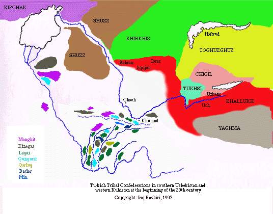 The first accounts of the composition of the tribes that populated southern Uzbekistan are provided by Russian explorers. Gathered at the turn of this century, the information indicates that present-day Uzbeks comprise a number of large and small tribes each with specific locations, tribal affiliations, and tribe and clan loyalties. The following are a few of the major Turkish tribes that lived in what is now southern Uzbekistan and western Kuhistan.