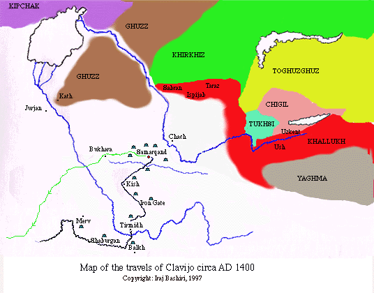 The discussion of the occupation of Transoxania by the Ghaznavids, the Seljuqs, and the Mongols is outside the purview of this paper. But the extent of Turkish distribution under these dynasties and the direction of Turkish expansion into the region fall within its scope. For instance, we are fortunate to have a first-hand 15th-century account about life in what is present-day southern Uzbekistan. The information is provided by Ruy Gonzales de Clavijo, the ambassador of the king of Spain to the court of Tamerlane. Clavijo provides a snap-shot view of Central Asia in 1405. His route took him from Merv to Samarqand, passing through Balkh, Termez, and Kish. At Termez, he reports, the language changed from Persian/Tajik into Chaghatai. From there he went to Kish and, eventually to Samarqand. All along the way, he reports, he was entertained in the yurts of the Chaghatais, except for a few occasions when he visited the neighboring towns. Clavijo, it should be mentioned, is the closest eyewitness we have of the situation in Central Asia at the time of the death of Tamerlane (1405).