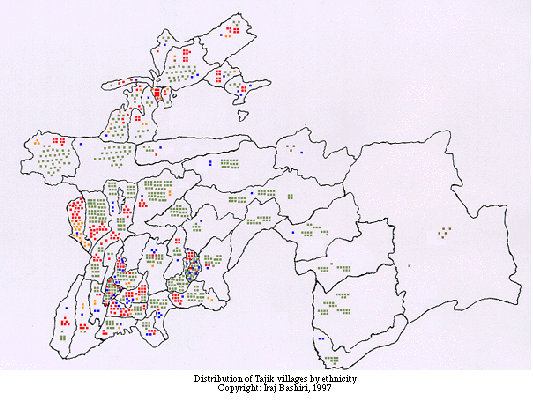 4) Russian, Kazakh, Tatar, etc. Except for 13 villages that are populated by Tajiks and Russians, most large urban centers (Dushanbe, Khujand, Kulab, Khorog) have a mixed population. For the purposes of this study, the 41 metropolitan areas represented in the Encyclopedia are not included in the survey. This, however, does not mean that they are not instrumental in deciding the direction of the assimilation process. They most certainly are; but a scientific account of their population mix is not available at the present time.