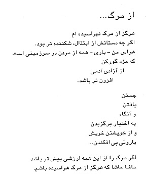 Shamlu's poetry is extremely complex. Yet his imagery, which contributes immensely to the intensity of his poems, is simple. For base, he uses the traditional imagery familiar to his Iranian audience through the works of Persian masters like Hafiz and Khayyam. For infrastructure and impact, he uses a kind of everyday imagery in which personified oxymoronic elements are spiked with an unreal combination of the abstract and the concrete thus far unprecedented in Persian poetry. To those familiar with the works of Nima, for instance, there is not a whole lot new, but those who adore the works of the masters find much that is distressful.