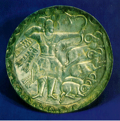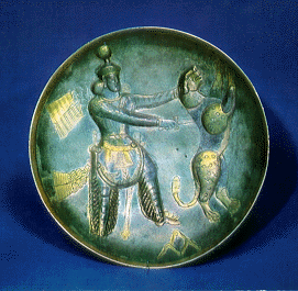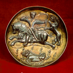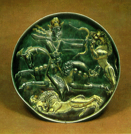 The silver plate with the representation of the Shahanshah (King of Kings) Shapur II (AD 309-379), a masterpiece of Iranian art, belongs to the Sassanian period (AD 221-651). The design in low relief was executed by hollowing out the ground with subsequent finishing with a chisel and poin¨ons. Additional elements are soldered onto the plate, giving separate parts of the design greater relief. Two successive scenes are portrayed in one composition: the battle with a lion, and the victory of the king. The form of the crown, which is well known from designs on coins, permits us to identify the hunter as Shapur II.