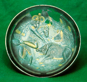 Building on such Achaemenian techniques as chasing, embossing, and casting, Sassanian artisans produced wonderful gold and silver vases, phials, and conical cups decorated with ibexes, flora, even human shapes. The dominant themes on cups, ewers, dishes, and bowls are hunting scenes depicting the monarch confronting lions or pursuing fleeing deer and zebras. The illustrations that follow are described by the curator of the Sassanian metalwork collection at the Hermitage.
