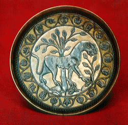 This plate with a lioness feeding her cubs is striking in its elaborate, well-balanced composition and in the strangely primitive portrayal of the figures. It is speculated that the craftsman transferred onto silver a net-like design originally embroidered on textile. The somewhat unusual treatment is due to the artist's desire to give a faithful rendering of his model, which had the technical peculiarities imposed by its material. The content of the scene is connected with the symbols of the universe, a characteristic feature of Sassanian art.