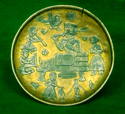 A ruler amid his servants and musicians is depicted. The conventional figures and the amazingly accurate rendering of details form an interesting combination. The vessels in the picture are easily identified as Sassanian silver ewers. The ornamental pattern on the dress of the ruler is similar to the design in the medallion on the plate with the "tigress." The goddess with diadem in her hand and the servants who have tied up their mouths, lest the sacred person of the king should be defiled by their breath, are figures characteristic of Sassanian art, despite the fact that the plate postdates the fall of the Sassanian dynasty. The crown and the attire of the prince contain details represented on art objects dating back to the late seventh century.