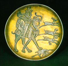 The composition on the plate originates from royal hunting scenes. The crown on the mounted figure suggests that an heir to the throne is portrayed here. In late Sassanian art careful attention is paid to the details of everyday life. The picture anticipates the later miniatures which are distinguished, on the one hand, by the strictly conventional proportions of the figures and the general highly decorative treatment of the subject, and on the other, by the utmost accuracy in the rendering of details. The torque on the neck, the ornamented silk collar with three rich pendants and leggings of tiger skin are elaborately delineated, and the rough skin of the prince's shaven cheeks is clearly seen. The decorative effect of the plate is enhanced by niello inlay.