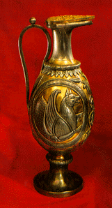 The form and proportions of the ewer, in their austere clarity, are reminiscent of classic architecture. The ewer is ornamented with relief designs produced by embossing from the back and finishing from the face with punches and poin¨ons. The designs have symbolic meaning. In the medallions are represented mythical senmuros, half beasts and half birds. Between the medallions is the Tree of Life.