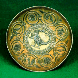 The plate with the representation of a clock is exceptionally interesting. Scholars are of the opinion that it shows a detail of the throne of the last powerful Sassanid, Shahanshah Khosrow Parvez (AD 590-628). His throne was decorated with a wonderful clock; each time when an hour passed, there appeared a chariot driven either by the Sun God, in the daytime, or by the Moon God, at night. The plate shows the Moon God driving his chariot with bulls harnessed to it. The Sun God, with a bow and arrows, stands inside a small edicule, thus symbolizing the sun below the horizon.