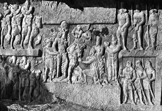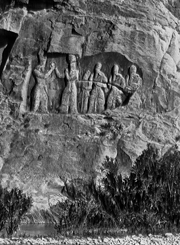 Like the Achaemenians (559-330 BC), the Sassanians (AD 224-651) dominated their era with noteworthy artistic achievements in coinage, decorative sculpture, architecture, and metalwork. Indeed, Ardashir I, recalling the glory of ancient Iran, inaugurated the new age with two massive reliefs near the present town of Firuzabad. The larger one, commemorating his victory over Artabanus V, combines three battle scenes. In the main scene (right of the picture), we see Ardashir himself unseating the Parthian monarch with a thrust of the long lance. The adjacent scene depicts Ardashir's son and successor, Shapur I, vanquishing the Parthian grand vizier. To the far left a Sassanian page clutches a Parthian page by the throat.