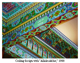 The ceiling panel for the entrance vault carries the words "Allahu Akbar" (God is Great), in the Arabic script and 1998, the date of the inauguration of the teahouse. The last panel, facing the entrance, carries the following text in the Cyrillic script: "Tajik master builders from the city of Leninabad," followed by the names of the builders in ornate Cyrillic. As the eye wanders, other Tajik names associated with the construction grace the vaults.