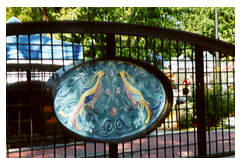 Well-known for territoriality and regionalism, Tajiks clearly mark the boundaries of their property with cultural markers. In the case of the teahouse, a bit of artistic work is added so that even those passing the teahouse on the right side of Boulder Creek feel they are a part of the structure. Verses from the "Ruba'iyyat" of Omar Khayyam, fancifully calligraphy on tile, decorate the pavement. The bridge at the end of the pavement is decorated with bird motifs reminiscent of Attar's "Conference of the Birds."