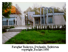 "Later on, teahouses became centers of gathering for war veterans, parliamentarians, scientists, artists, and poets. During the 1970s and 1980s, in major cities like Dushanbe and Khujand, as well as in the centers of regions and often rayons (districts), a series of splendid teahouses were constructed. Decorated in national style, these teahouses are distinguished by name in each city. For instance, our Dushanbe is known for the 'Sa'odat,' (which means "Felicity") the teahouse we are in, 'Rohat,' 7 (which means "Comfort") and Faroghat,'8 (which means "Leisure") which are on our way to the hotel. I think I showed them to you as we walked by them. They are all on the same side of the street as 'Sa'odat.'