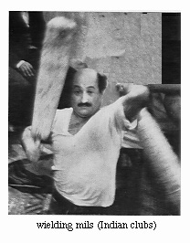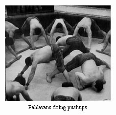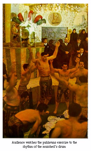 The exercises are varied. They include wielding the mil (Indian Club), pulling the kaman (bow-shaped iron weights), lifting various types of weights, push-ups, and gyration. Usually, the exercises begin with acrobatics and juggling presented by the pishrav (novice). They end with a wrestling match between two tested pahlavans. This is the event that determines whether the current champion is able to defend and hold his title. Before the wrestling begins the murshed places some fragrant espand on the fire to divert the evil eye. Some champions, it should be added, wear arm bands containing appropriate prayers for the same reason. The wrestling is accompanied by prayers invoking the prophet, the imams, and the ulema. It also includes supplication to Allah on behalf of the sick and the infirm in society. When wrestling, the contestants hold each other tightly by the cummerbund or the belt, each trying to force the other off balance. The objective is to make the opponent's shoulder touch the floor of the pit |