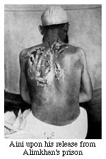 Aini's knowledge of the atrocities of the Amirs was first hand. Indeed, it was his vivid descriptions of the Arg and the hellish scenes therein that prompted me to visit Bukhara and its proverbial Arg fortification. arrested as a revolutionary by Alimkhan's henchmen, Aini was imprisoned in the Arg. Unlike those whose hands were tied in the front--a sign to the watching crowd of the forthcoming execution--his hands were tied in the back. He was administered 75 lashes of the whip and he would have died, had not Bukhara fallen that day and had he not been taken to Kagan to receive medical attention.