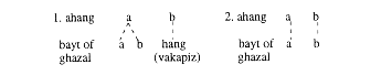 The asasi and ilavagi shu'bas of nasr have the same internal structure. Their components include: sarkhat (overture), miyankhat, dunasr; avj, and faravard. Except for avj,7 each one contains two musical chords and uses only one bayt of a ghazal. The well-known maqam scientist, I. R. Rajabov, describes khat as follows: "... a melody for which one bayt (or two misra's of a ghazal ) is used."8 According to their own compositional function, the first three khats: sarkhat, miyankhat, and dunasr show the main melodic content of the mode in its full form and fortify the position of the tonic value of the maqam. The expanse of the degrees of music and the manner in which it is brought into existence (by the interconnection of the taranahs) is also a function of these first three khats. The amount of the namud, theoretically speaking, is between two and three. The shu'ba is concluded with the final faravard khat. This concluding khat, based on the sarkhat, after various uses, establishes the basic maqam, and using the descending loops, takes the melody to the register of the overture. The structural makeup of the khat, which includes two bands and ahangs, is similar to the bayt. There are two types of combinations of misra's and melody in a maqam. This kind of correspondence creates two types of lines. The first one is related to a special overture's shu'bas; the second relates to all the other shu'bas. The above statement can be illustrated as follows: