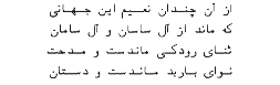 We know that before the Arab invasion, Persian verse, being syllabic, did not conform to the Arabic metric system. Those familiar with the Arabic meters, considered the syllabic verse to be a kind of prose. That is why Awfi, who was familiar with the Arabic metric system, assessed Bahram's syllabic verse as follows: "He [Bahram] was the first to compose poetry in Persian. During the time of Parviz many such compositions existed and were put to music by Borbad.20 But, since these poems are devoid of meter, rhyme, and the other trappings of poetry, we have not dealt with them in any substantial manner."21 This statement indicates that even at the time of Awfi some form of the syllabic verse was still in existence. The frequent references to the songs of Borbad and Nakisa in Persian, during early Islamic times, is indicative of the prevalence of this kind of verse at that time. Furthermore, there are documents indicating that Borbad's verses had been published at that time. The following poem of Mujladi (or Makhlidi) Gurgani, who lived at the end of the 4th or beginning of the 5th century AH, is indicative of that: 22