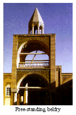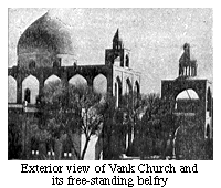 | The free-standing belfry of the Vank Church is built directly opposite from the main entrance of the church. The complex funded by Huhanjan Jamalians, during the reign of Shah Sultan Hussein, carries a number of inscriptions as well as serves as the resting place of several well-known Armenians of Julfa.