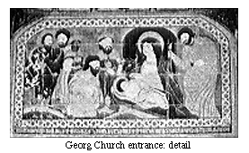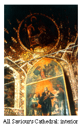 The most memorable church in Julfa, the one that comes to mind upon mentioning the name of the city, is the Amenaperkich or the Church of the Saviour. Also referred to as Vank, the church was constructed between 1655 and 1664--during the reign of Shah Abbas II--by funds contributed by the Armenian population of Julfa. The exterior of Vank Church recalls the brick architecture of the Jami' Mosque built by the Saljuqs across the river; the interior is adorned by paintings heavily influenced by Italian artists. The amount of gold used by Iranian artists in the interior decoration of this church surpasses the gold used in all the other churches combined. | ![]() |