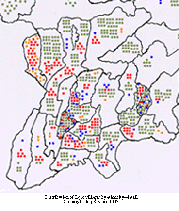 1) Primarily Tajik (deep blue). Almost all rayons have at least one village that is primarily Tajik. Primarily Tajik means that some time in the recent past Uzbeks have moved into the village in sufficient strength to have a role in its administration and future direction. Surprisingly enough, even the West Badakhshan rayons, except Rushan, have at least one such pioneer settlement. Altogether, the data includes 73 primarily Tajik villages.