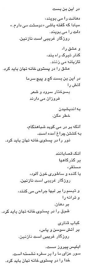Shamlu's poetry is extremely complex. Yet his imagery, which contributes immensely to the intensity of his poems, is simple. For base, he uses the traditional imagery familiar to his Iranian audience through the works of Persian masters like Hafiz and Khayyam. For infrastructure and impact, he uses a kind of everyday imagery in which personified oxymoronic elements are spiked with an unreal combination of the abstract and the concrete thus far unprecedented in Persian poetry. To those familiar with the works of Nima, for instance, there is not a whole lot new, but those who adore the works of the masters find much that is distressful.