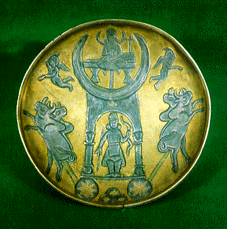 The plate with the representation of a clock is exceptionally interesting. Scholars are of the opinion that it shows a detail of the throne of the last powerful Sassanid, Shahanshah Khosrow Parvez (AD 590-628). His throne was decorated with a wonderful clock; each time when an hour passed, there appeared a chariot driven either by the Sun God, in the daytime, or by the Moon God, at night. The plate shows the Moon God driving his chariot with bulls harnessed to it. The Sun God, with a bow and arrows, stands inside a small edicule, thus symbolizing the sun below the horizon.