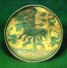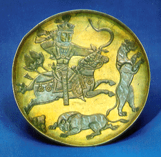 The silver plate with the representation of the Shahanshah (King of Kings) Shapur II (AD 309-379), a masterpiece of Iranian art, belongs to the Sassanian period (AD 221-651). The design in low relief was executed by hollowing out the ground with subsequent finishing with a chisel and poin¨ons. Additional elements are soldered onto the plate, giving separate parts of the design greater relief. Two successive scenes are portrayed in one composition: the battle with a lion, and the victory of the king. The form of the crown, which is well known from designs on coins, permits us to identify the hunter as Shapur II.