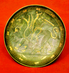 The scene on the plate illustrates a legend very popular in medieval Iranian arts. Azadeh, the beloved of Prince Bahram Gur (Sassanian King Varakhran V, AD 421-439), saw a herd of gazelles and asked the prince to turn a buck into a doe, and a does into a buck. With a special crescent-headed arrow the prince shot off a buck's antlers, thus turning him into a doe; then he shot at a doe, planting two arrows in the place where antlers grow, thus turning her into a buck; with the last shot, he pinned the ear of a buck to his shoulder while the animal was scratching with his foreleg. This motif was used by Firdowsi in his Shahname (10th century); but, as the plate shows, the legend existed as early as the seventh century.