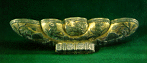 Toward the end of the Sassanian epoch, a necklace with three pendants became an obligatory part of the kings attire. A bird with such a necklace in its beak, seen in the medallion, is symbolic of a divinity investing the king with royal power. The motifs and character of the design remind one of ornamental details of Sassanian architecture or the patterns on Sassanian silks. Iranian craftsmen often borrowed decorative motifs from other arts and crafts: this, to a significant degree, explains the stylistic diversity of their work.