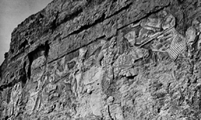 Like the Achaemenians (559-330 BC), the Sassanians (AD 224-651) dominated their era with noteworthy artistic achievements in coinage, decorative sculpture, architecture, and metalwork. Indeed, Ardashir I, recalling the glory of ancient Iran, inaugurated the new age with two massive reliefs near the present town of Firuzabad. The larger one, commemorating his victory over Artabanus V, combines three battle scenes. In the main scene (right of the picture), we see Ardashir himself unseating the Parthian monarch with a thrust of the long lance. The adjacent scene depicts Ardashir's son and successor, Shapur I, vanquishing the Parthian grand vizier. To the far left a Sassanian page clutches a Parthian page by the throat.