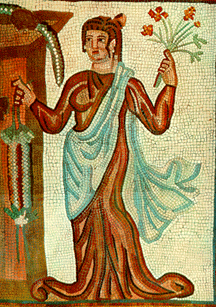 Rather than with carpets, some floors of the aivans were covered with colorful mosaic panels depicting women weaving garlands, dancing, holding bouquets, playing the harp or, simply, reclining on cushions. This woman, holding a bouquet, is an example of Sassanian mosaic panels.
