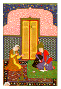 On Thursday, the day of Jupiter, dressed in clothes the color of sandalwood and a headgear to match, Bahram set forth for the pavilion of his Tartar beauty. In her best light brown dress, amid the fragrance of sandalwood incense, she greeted Bahram, amused him during the day and told him the following story at night.