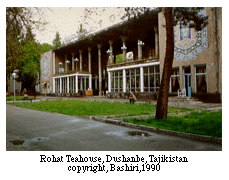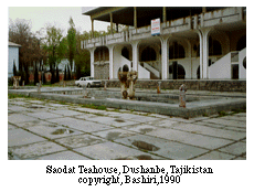 "Later on, teahouses became centers of gathering for war veterans, parliamentarians, scientists, artists, and poets. During the 1970s and 1980s, in major cities like Dushanbe and Khujand, as well as in the centers of regions and often rayons (districts), a series of splendid teahouses were constructed. Decorated in national style, these teahouses are distinguished by name in each city. For instance, our Dushanbe is known for the 'Sa'odat,' (which means "Felicity") the teahouse we are in, 'Rohat,' 7 (which means "Comfort") and Faroghat,'8 (which means "Leisure") which are on our way to the hotel. I think I showed them to you as we walked by them. They are all on the same side of the street as 'Sa'odat.'
