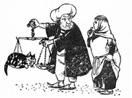 The same thing happened several days in a row and Mullah patiently listened to the story about the cat. Finally, one night while listening to the story he saw the cat pass by. Quickly he jumped on the cat, caught it, and put it on the scales. When he saw that the cat weighed exactly one kilo, he turned to his wife and said, "Khanom, if this is the cat, where is the meat; and if this is the meat, pray tell, where is the cat?