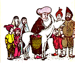 With great difficulty, he rode his donkey backward, lest he dishonor his friends by turning his back to them. One of his friends then handed him the heavy bag. Instead of placing the bag in the saddle, Mullah held it at the end of his out stretched arm, away from the donkey. The donkey began to move in the direction of Mullah's house.