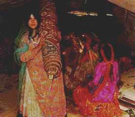 The chador or tent is the smallest unit in the nomadic societies of Iran. It is headed by a male who, along with a few other males and some females, provides food stuff and other necessities for the chador. Each chador accommodates a household that consists of grandparents, parents, and children. Together they see to the needs of the extended family as well as contriobute to the daily chores of the tireh. |